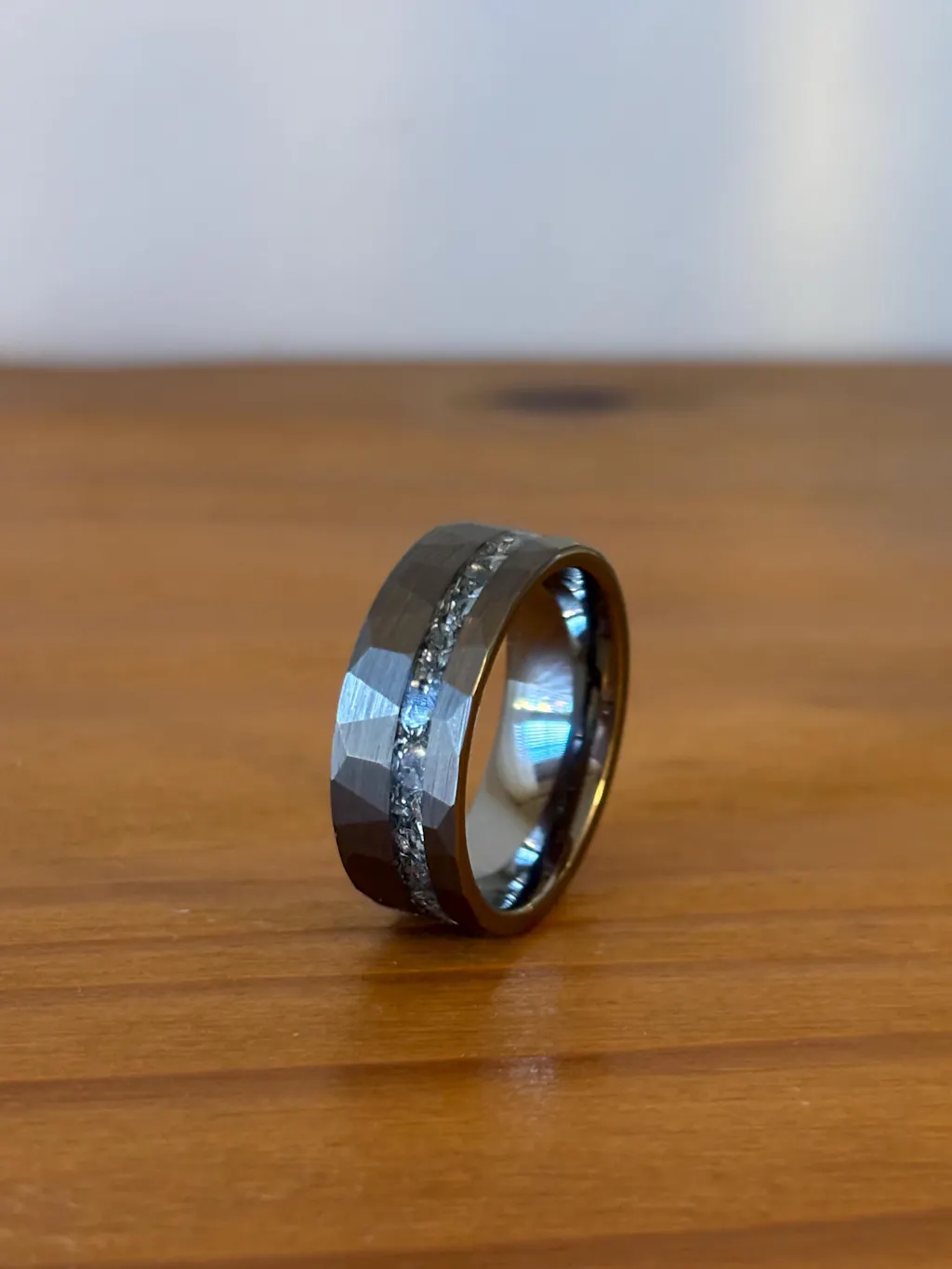 Hammered Silver Meteorite Wedding Ring – 8mm Tungsten Band.
