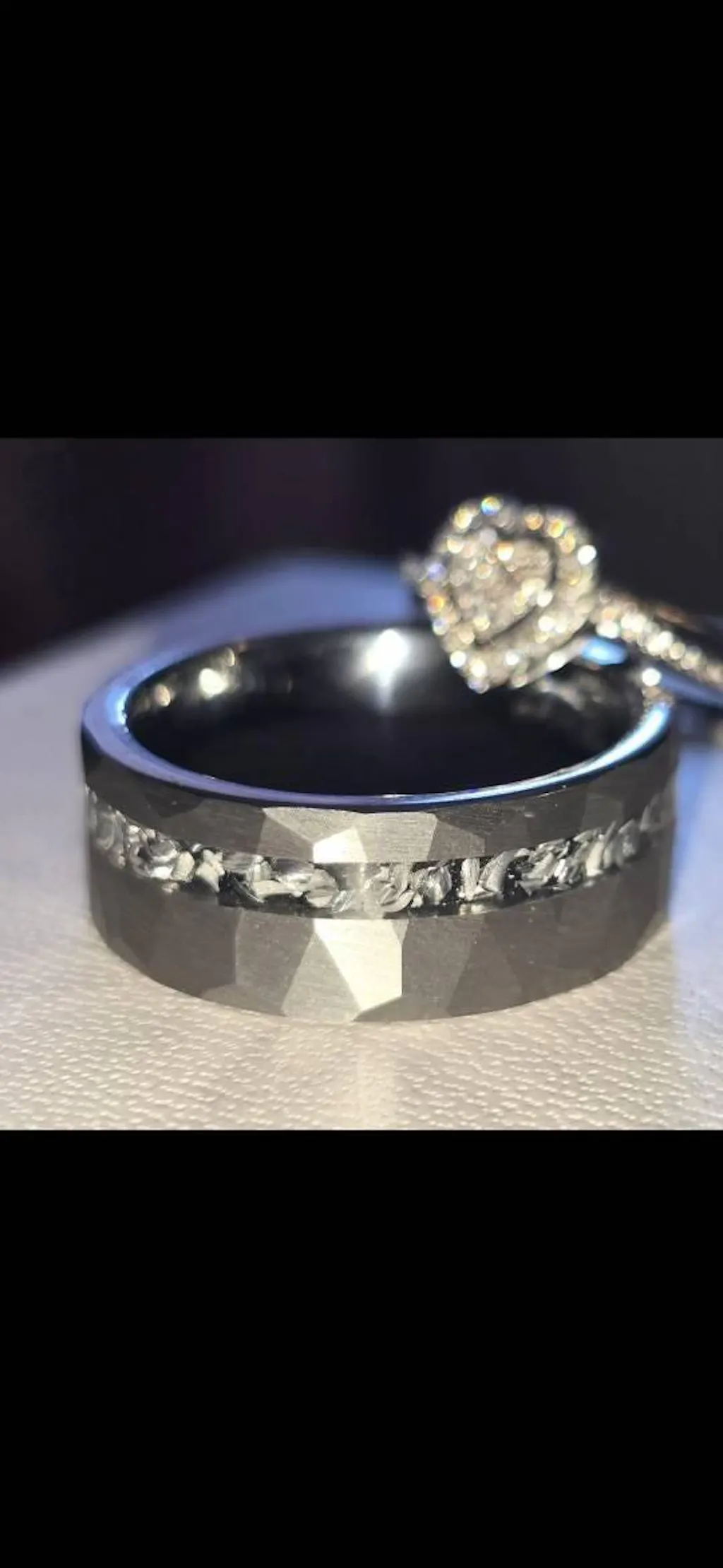 Crafted to stand apart, this meteorite wedding ring combines raw texture with cosmic detail. Made from durable tungsten, the ring features a hammered silver finish that gives each piece a rugged, organic character.